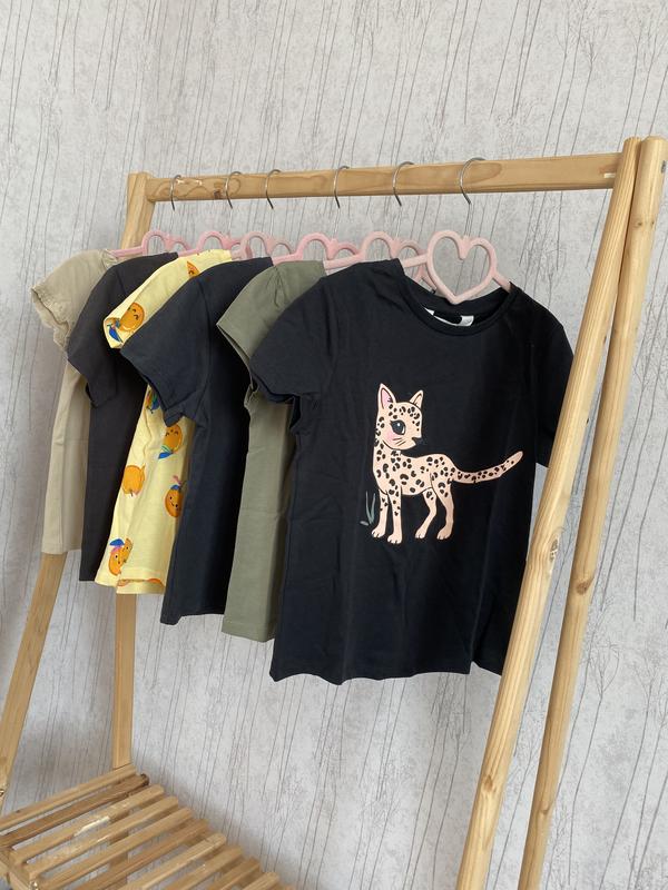 Футболка hm 110/116, усі на фото у наявності . Ціна за 1 шт . Є нюанс , від того , що лежали , заломи трохи втратили колір . в носці не видно . Жовта не рівні плечі на вішалці не дуже помітно