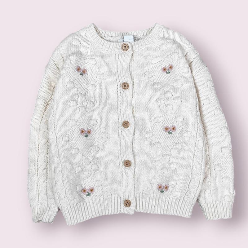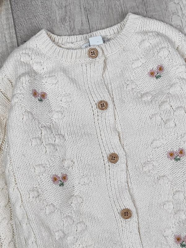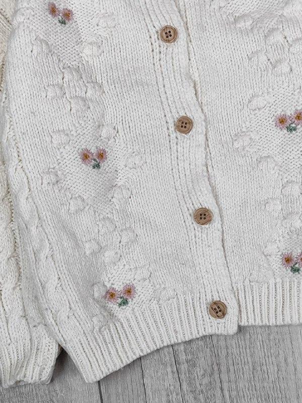 В'язана біла кофта для дівчинки Primark. Застібка гудзики. Спреді нашиті квіточки. Круглий виріз горловини.