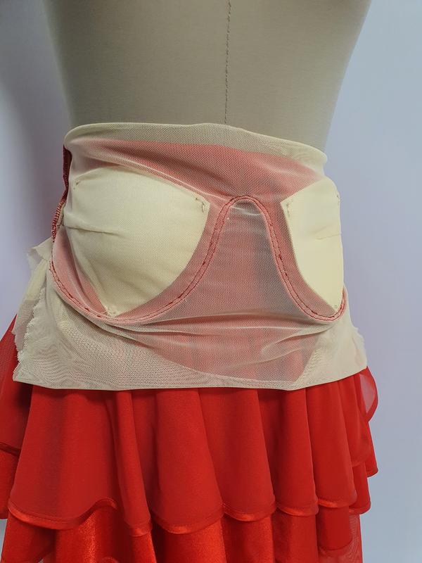 Конструкція: боді з червоного біфлексу із верхом з бежевої сітки, без рукавів, кругла горловина; трьох шарова спідниця оброблена атласною бейкою, перший та третій шари спідниці із сітки, другий шар - із біфлексу; на спині потаємна змійка, тонкі чашки вшиті у боді між сіткою та біфлексом, дві тонкі атласні петельки для зручного перевезення костюму на тремпелі.