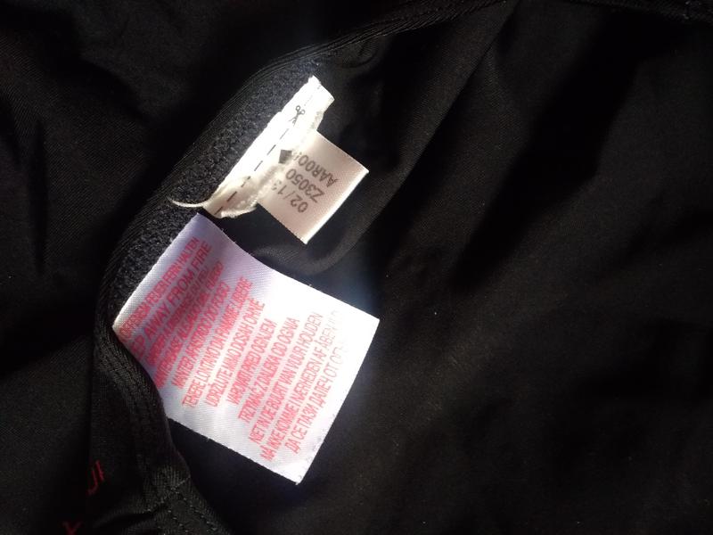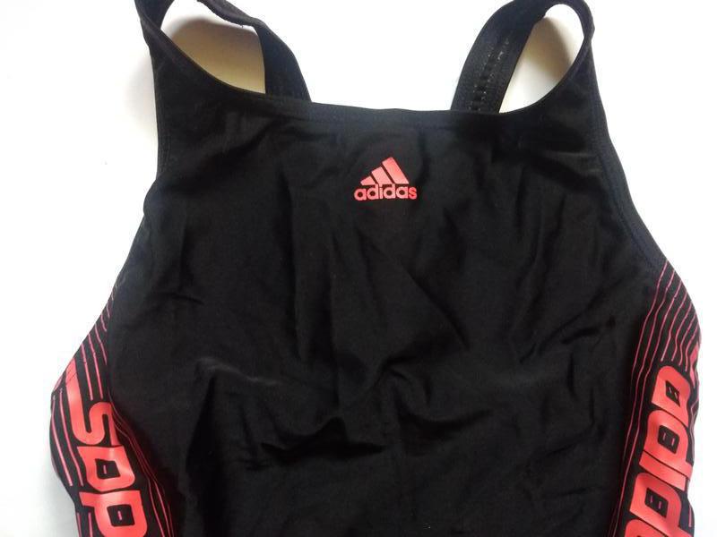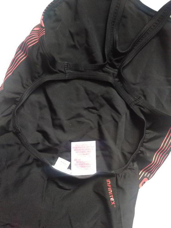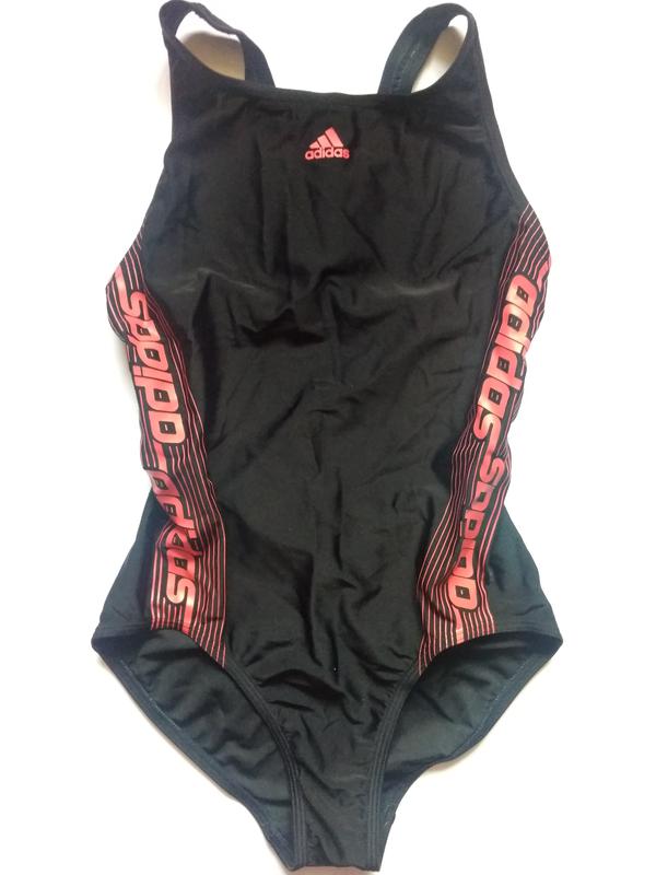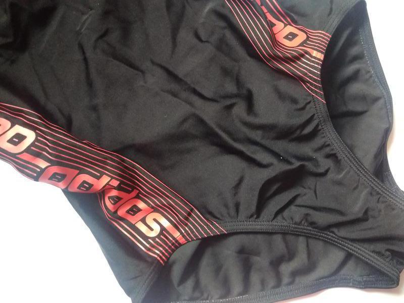 фирменный купальник для бассейна черного классического цвета с красными прорезиненным напылением надписями бренда, хорошо сидит на теле, не сковывая движения, удобный и практичный.