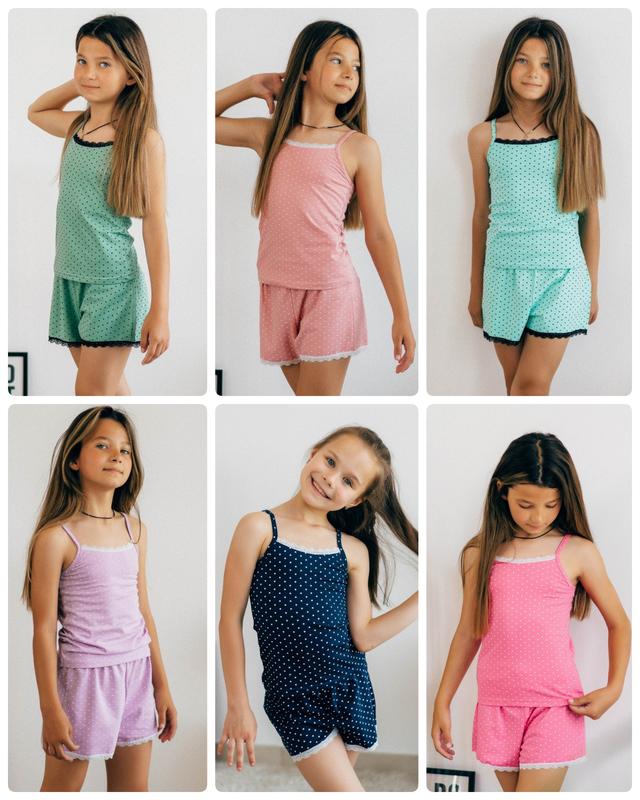 Літня піжама для дівчаток із натурального полотна "Стрейч-кулір пеньє". Модель складається з майки-топу на тонких бретелях з м'яким мереживом, а також коротких шортиків на гумці, на шортах розташований бантик. Стрейч-кулір легкий, в міру тонкий, натуральний за складом – ідеальний матеріал для спекотного літа. Полотно: стрейч-кулір. Склад: 95% бавовна, 5% еластан.