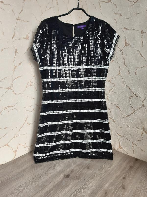 Ошатне плаття в паєтки чорна з білою смужкою.На підкладці. Довжина 80 ПОГ 40 ПІТ 38 ПОБ 45 Плечі 32 руеав 12 Стан нове без паперової етикетки