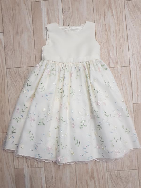 іднальний стан, одягали кілька разів, розмір 4т, фірма Cinderella, на 4-5 років. Колір молочний, спідниця з підкладкою. заміри: Плечі 23, пояс 27, довжина 67, ширина між руками 28