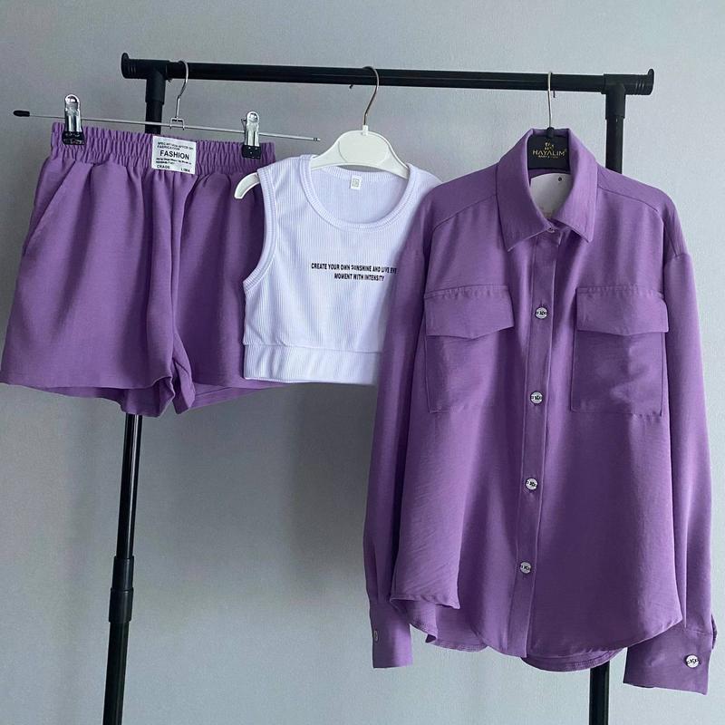 тканина костюму: американський креп тканина топу: рубчик ЯКІСТЬ ЛЮКС!!!🔥🔥🔥 колір: лаванда ЗАМІРИ: р. 128 рубашка: довжина/рукав/ширина 53/62/44 шорти: довжина/стегно/пояс 29/44/25 топ: довж/резинка 25/26 р.134 рубашка: довжина/рукав/ширина 55/64/46 шорти: довжина/стегно/пояс 30/46/25 топ: довж/резинка 26/27 р.140 рубашка: довжина/рукав/ширина 56/65/47 шорти: довжина/стегно/пояс 32/48/26 топ: довж/резинка 28/27 р.146 рубашка: довжина/рукав/ширина 58/66/50 шорти: довжина/стегно/пояс 34/49/27 топ: довж/резинка 29/28 р.152 рубашка: довжина/рукав/ширина 60/69/52 шорти: довжина/стегно/пояс 36/51/28 топ: довж/резинка 30/28 р.158 рубашка: довжина/рукав/ширина 65/72/54 шорти: довжина/стегно/пояс 37/52/29 топ: довж/резинка 31/29 р.164 рубашка: довжина/рукав/ширина 67/74/56 шорти: довжина/стегно/пояс 38/53/30 топ: довж/резинка 33/30
