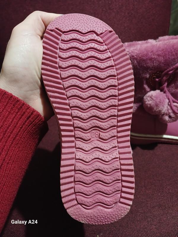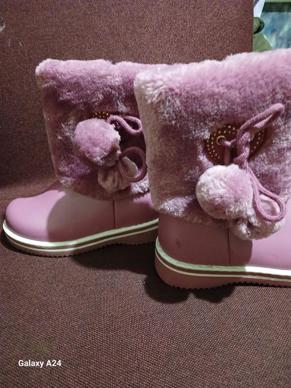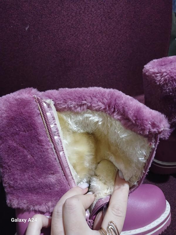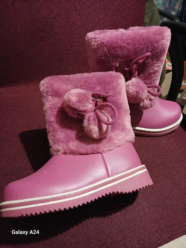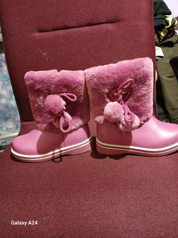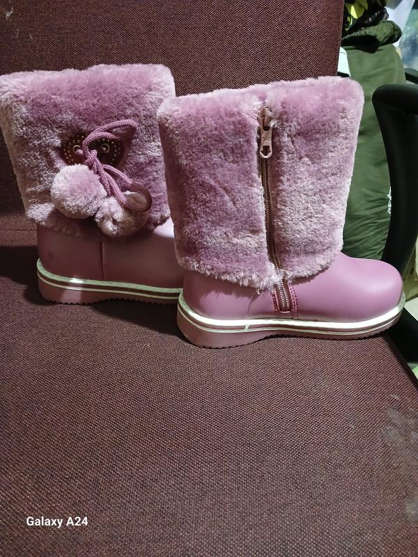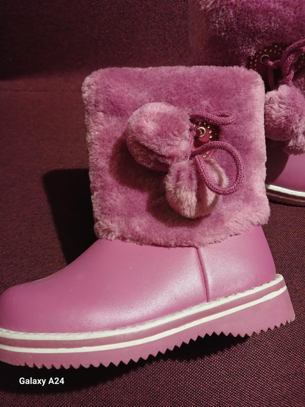 Нові зимові теплі чобітки на дівчинку 28р-18 см по устілці,ніжно фіолетово-бузкового кольору,з пампонами на зв'язках збоку.Ззовні якісна штучна шкіра,доволі висока та легка підошва,збоку на блискавці,високі,дитині буде тепло.
