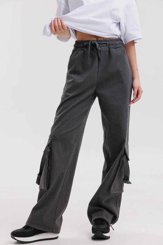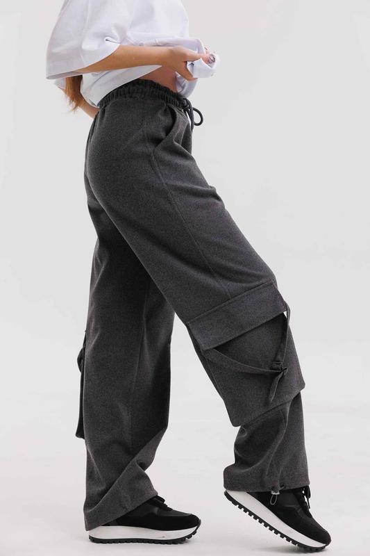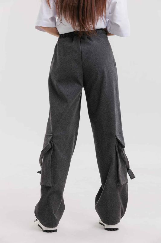 Штани карго сірого кольору для дівчинки підлітка. Тканина кашемір, чудово підійде на осінь-зиму. У поясі резинка і шнурок, що стягує. Знизу на штанях є куліска - штани можуть стягуватися.
