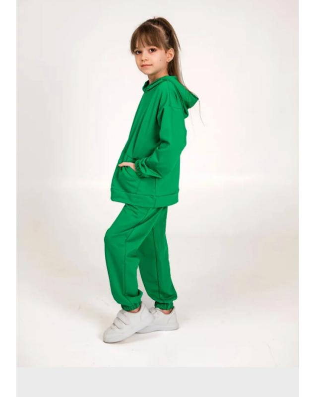Спортивний костюм (140 см)Якісна тканина - двунить.Кармани на худі, резинка та шнуровка на штанах.Насичений зелений колір