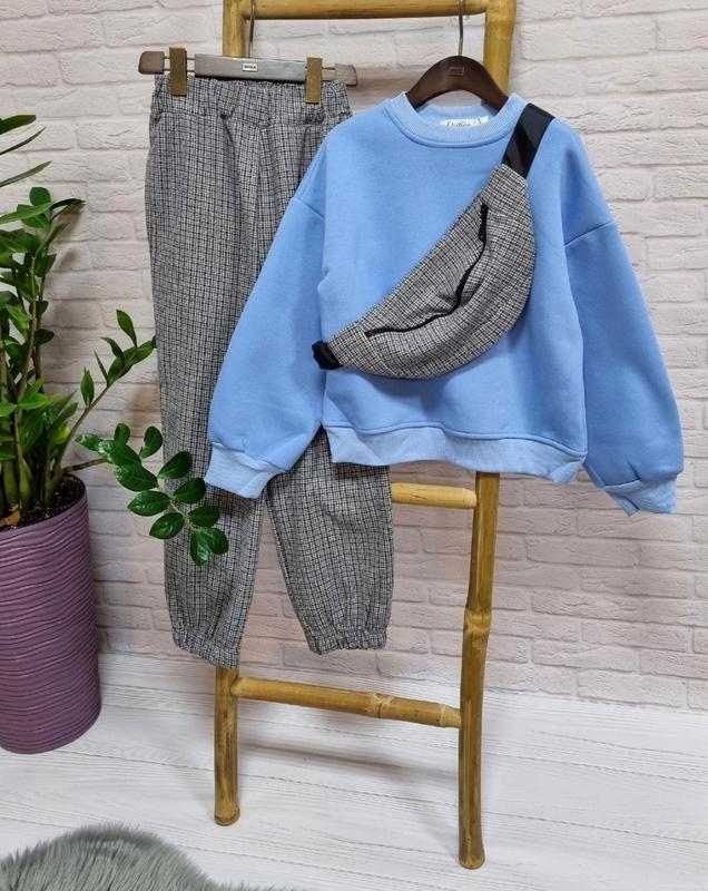 спортивний костюм з банкою конв Новинка!!! Прогулянковий спорт-шик костюм трійка😍! В комплект входить теплий світшот - трьохнитка на флісі+ штани джогери з теплої мякенькоі тканини , приємної до тіла . Також в комплект входить модна та зручна сумка- бананка- можна носити на поясі , на плечі…. або з іншими речами. 134(1 шт)-довжина кофти 48,пог 43,рукав 60/40,довжина штанів 80,крок 58,пояс 25,поб 40
