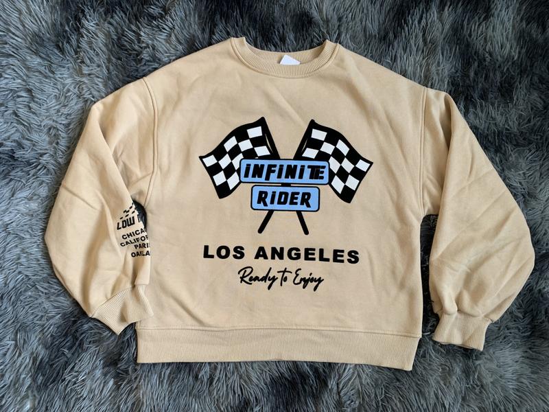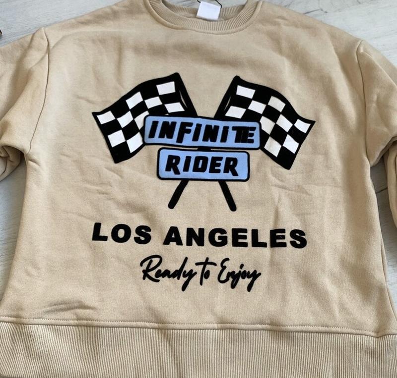Світшот із круглим коміром і довгими рукавами. Флокований принт спереду та окантовка в рубчик по краях.