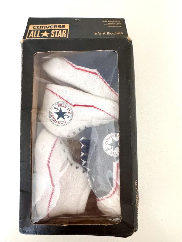 Новий набір дитячих , для немовлят шкарпеток Converse. Пакування помʼяте, на подарунок не підійде, а собі якраз. Розмір : на 0-6 місяців. Склад : 80 % бавовни.