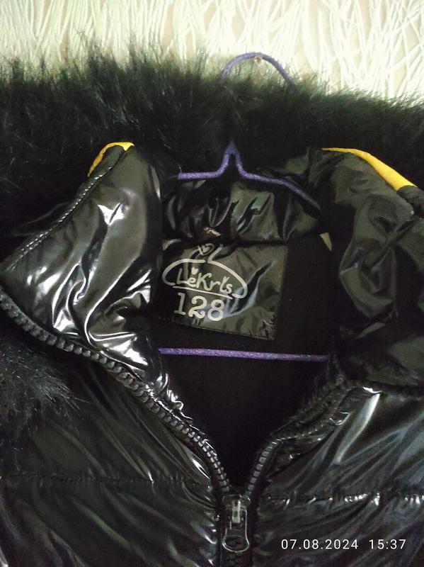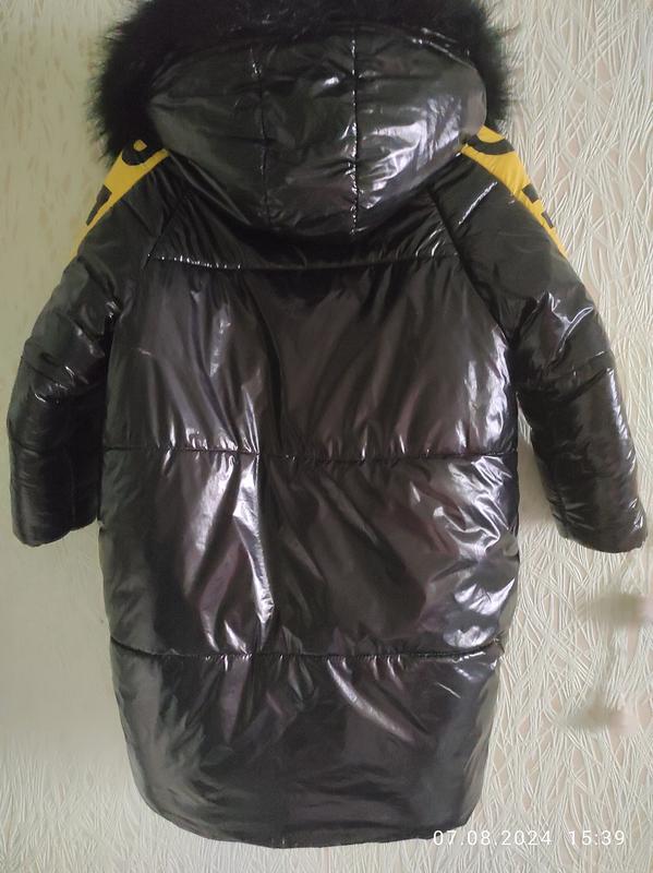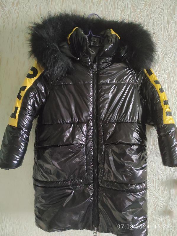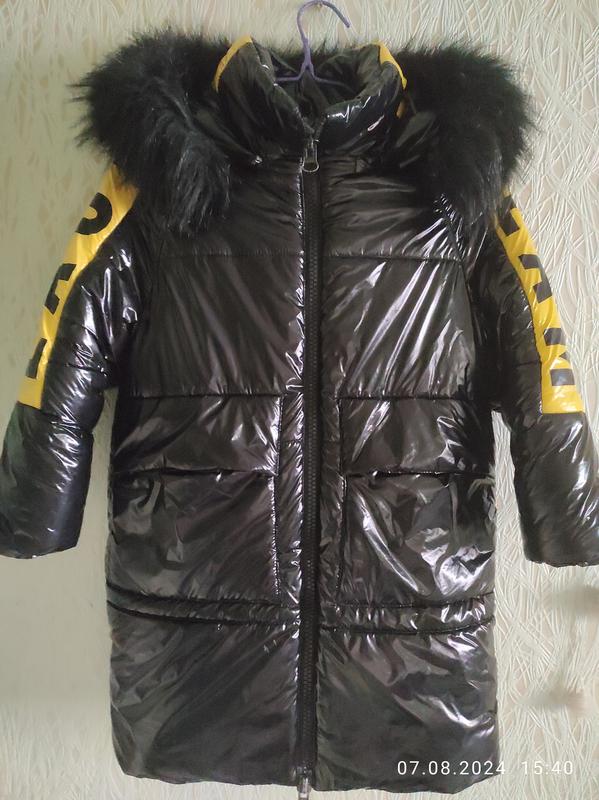 Красивий, практичний, теплий глянцевий пуховик чорного кольору з жовтим літерним принтом на рукавах, з прихованими кишенями, зі зйомним капюшоном з хутром, на блискавці. Розмір 128. Теплий, добре та рівномірно набитий, не важкий. Стан дуже хороший, випраний. Причина продажу - дитина виросла.