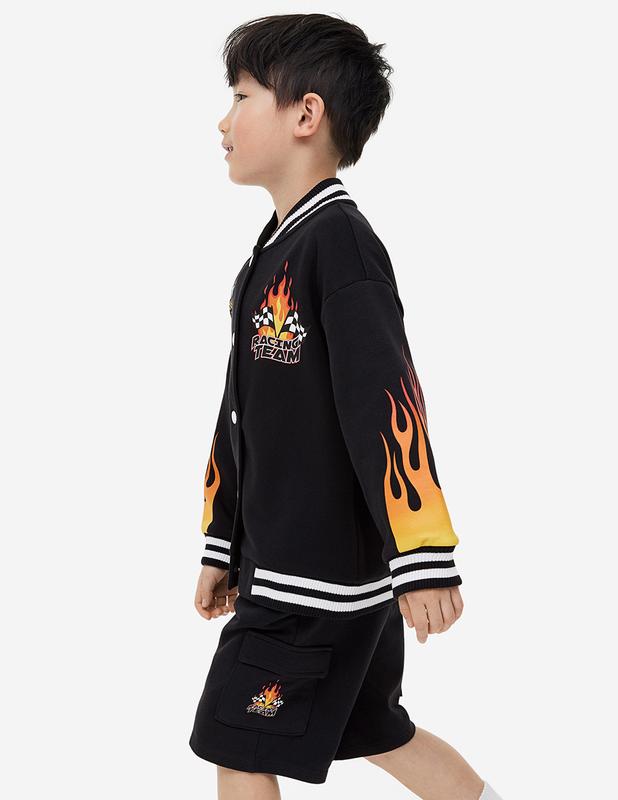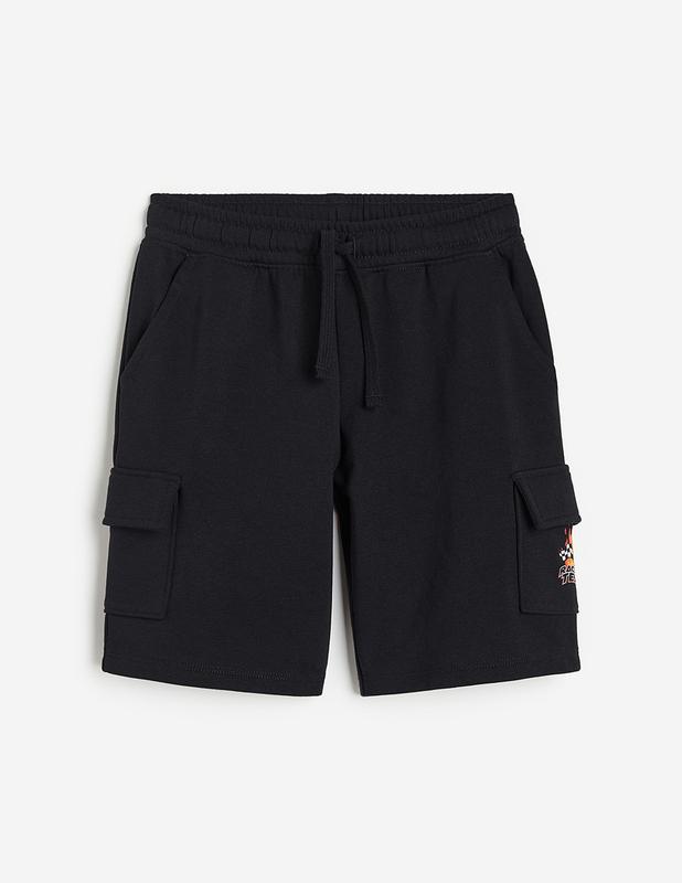 Вільні шорти до коліна з еластичним поясом зі шнурком із легкої світшотної тканини з принтом на одній ніжці. Похилі бічні кишені та дві кишені на штанинах з клапаном