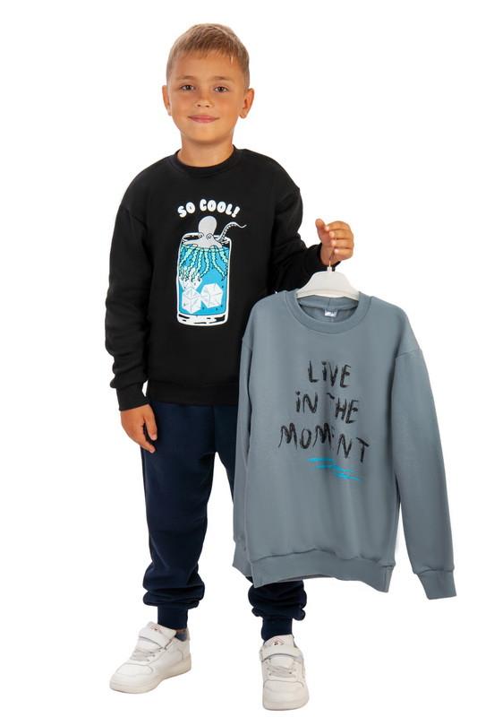 Комплект виконаний з футера з начосом. Полотно натуральне, тепле, приємне до тіла. Модель з округлою горловиною, манжети, горловина і по низу - приклад зі стрейчу. Рукав - реглан. Модель добре підійде до спортивних штанів, джинсів, штанів.