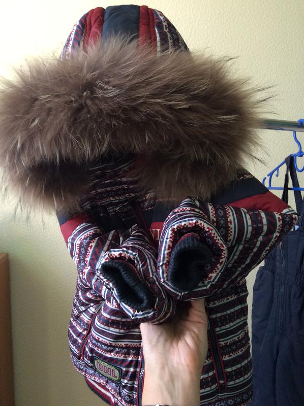 Зимовий костюмчик Donilo - дуже теплий, красивий і практичний для зимових прогулянок в морозну погоду. Розрахований на 2 сезону шкарпетки : з подворотами іде в розмір, на наступну зиму відвертаєте подвороты -що додає приблизно по 4-5 см довгі рукавів і довжині штанин напівкомбінезона.Опушення на капюшоні натуральне пухнасте хутро( відстібається),не дає снігу залітати в обличчя дитини . Капюшон , на флісовій підкладці-відстібається.Підкладка куртки всередині( крім рукавів ) - фліс.Напівкомбінезон високий, до пахв, спина закрита, по талії резинка, бретелі - регулюються,підкладка вище талії-фліс. Кишені:3 на куртці( 1 всередині , на липучці); 2 на напівкомбінезоні .Світловідбивачі: 1 ззаду , 1 спереду на куртці , у вигляді нашивок.Фурнітура хороша, костюм добре сидить на дитині. Замеры: Шаговый шов внутренний (в подвёрнутом виде) до края резинки внизу 36(39 с развёрнутым отворотом); Шаговый шов внешний 56( 60 с отворотом); Рукав куртки по- плечу 35 см( 39 см с отворотом ); Полуобхват куртки по -груди 40 см; Полуобхват полукомбинезона по- талии 25 см; Длинна куртки по- спине от капюшона- 44 см;