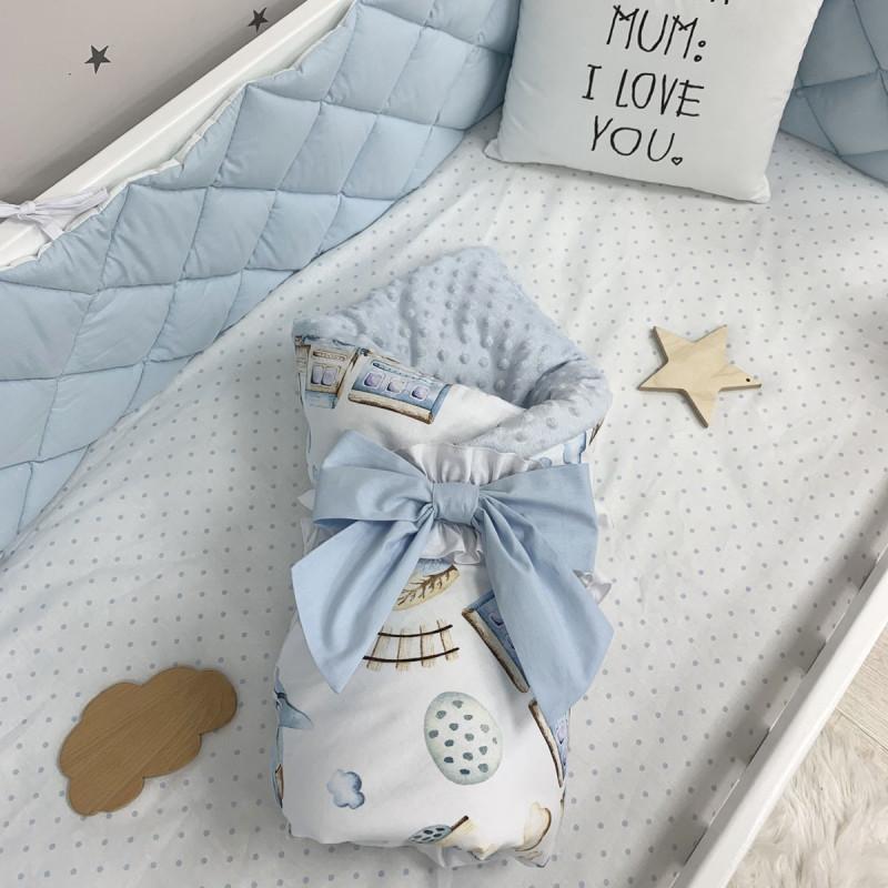 Плед конверт дитячий з ковдрою, поплін та плюш, розмір 80х100 см, паровозики топ
