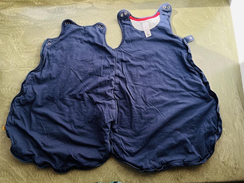 Синього кольору з пухнастим биком і мишкою. Застібається на блискавку периметром і на кнопочки на плечах.
