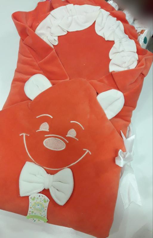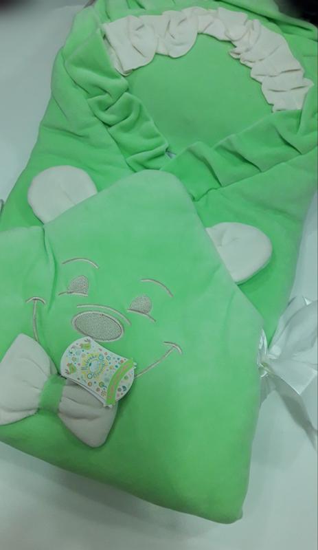 Ніжний велюровий конверт на виписку новонародженого з пологового будинку 🤗❤️ Виробництво Україна "Маленьке Сонечко" - 100% бавовна. Розмір: до 68 см Колір: кораловий, рожевий, салатовий.