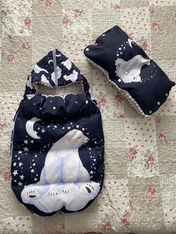 Залишилася задоволеною на 100%. Дуже теплий. Розмір 0-6 міс водовідштовхувальна тканину утеплювач до -20 всередині м'який плюш вітронепродувна тканина На муфті відсутня одна кнопочка Ціна за конверт і муфту
