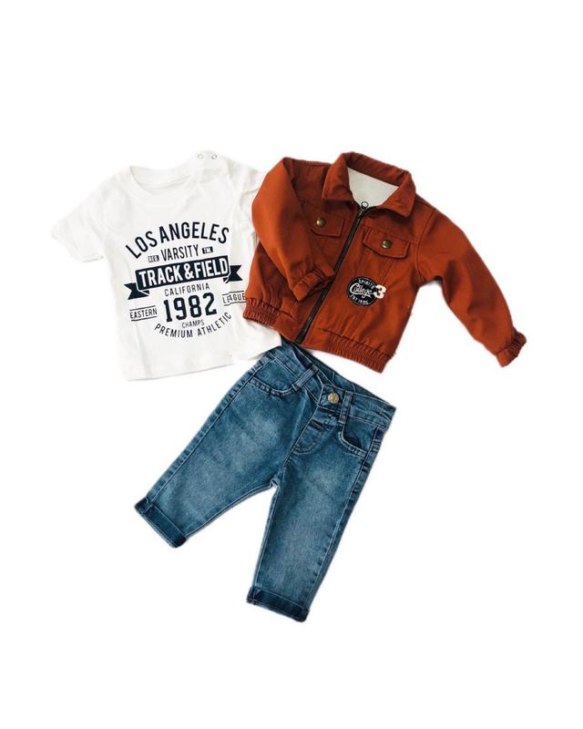 Дуже стильний та зручний костюм 3-ка для хлопчика. До комплекту входить куртка-теракотового кольору,футболка-білого кольору з написом та джинси сіро-блакитні.За одну покупку маєте три речі які можна поєднувати з іншим одягом.