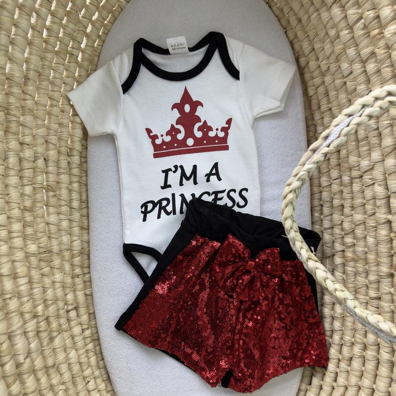 Неймовірний, стильний набір для вашої принцеси! Тканина: бавовна. В комплекті футболка – боді на кнопочках та шорти, прикрашені спереду паєтками. Виробник: Туреччина. Малюнок накат! Розміри: 1р – довжина боді 36 / півобхват 20 – довжина шортів 20 / півобхват шортів 20