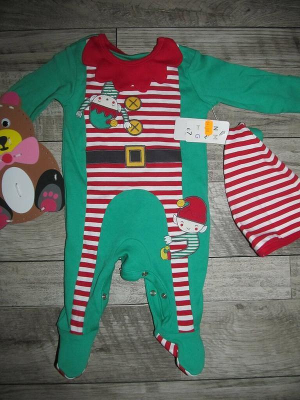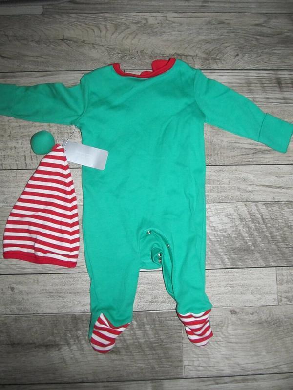 Новорічний сліп комбінезон Різдвяний ельф Nutmeg на новонародженого 0-3 міс 56-62cm + шапочка. Виконаний з мягенького котону, склад тканини 100% коттон. Заміри : довжина від плічка до низу штанини - 50см, від плеча до памперса -34см, рукавчик від горловини 31см. ширина 27см,кроковий шов - 15см. Стан - новий. Ціна - 200грн. Дивіться всі мої оголошення - багато цікавого і завжди приємні ціни :)
