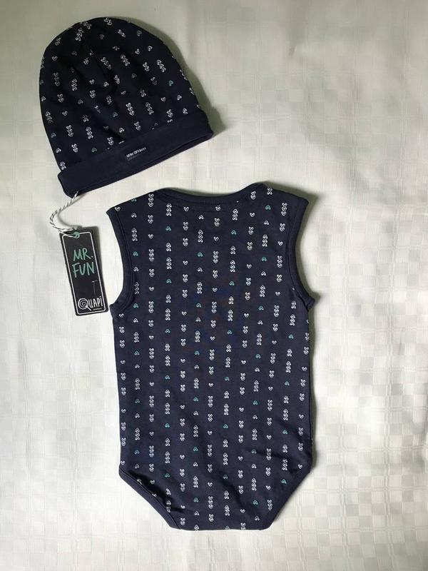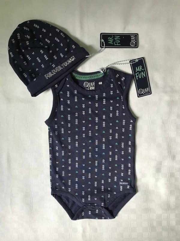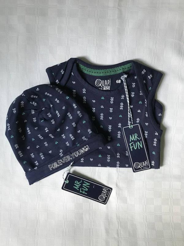 Дуже гарний та якісний комплект для хлопчика, набір для малюка від фірми Quapi (Нідерланди).В набір входить: боді та шапочка. Розмір: боді - 68 (3-6 міс), шапочка - One size.Новий з етикетками, без торгу.