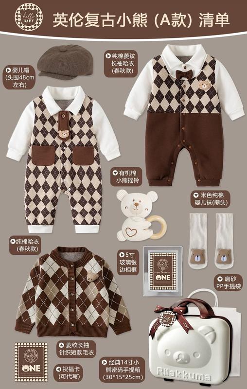 Подарунковий набір одягу для хлопчика в британському стилі До комплекту входить: - прозорий пакет -валіза -2 комбінезони -кофтинка на ґудзиках -картуз -шкарпетки -скляна фоторамка -брязкальце -листівка вітальна