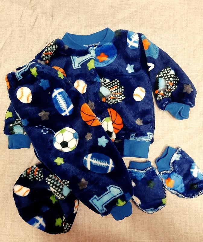 Чудовий комплект для хлопчика. В комплекті шапочка на зав'язках ,пінетки,штани,кофточка на гудзиках. Махра дуже приємна-класу софт, м'яка, щільна. Буде гарним подарунком для маленьких модників. Розмір 22( 68-74см). Відправка по передплаті повній або частковій укр, нова пошта.