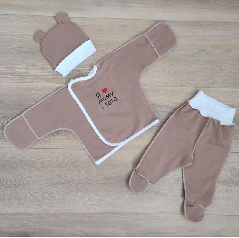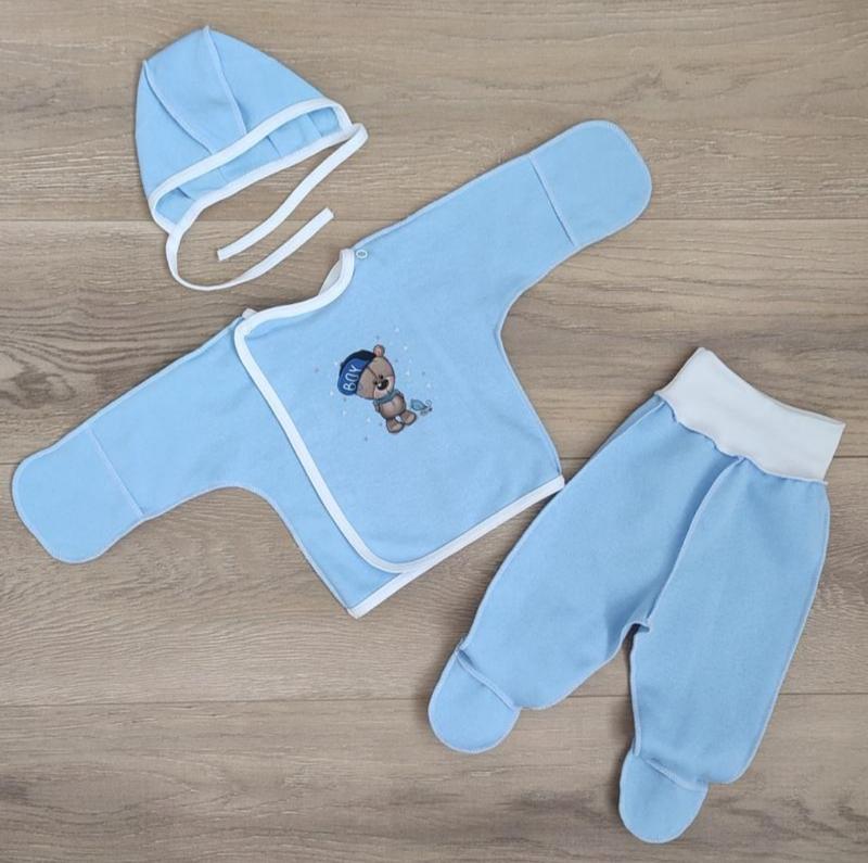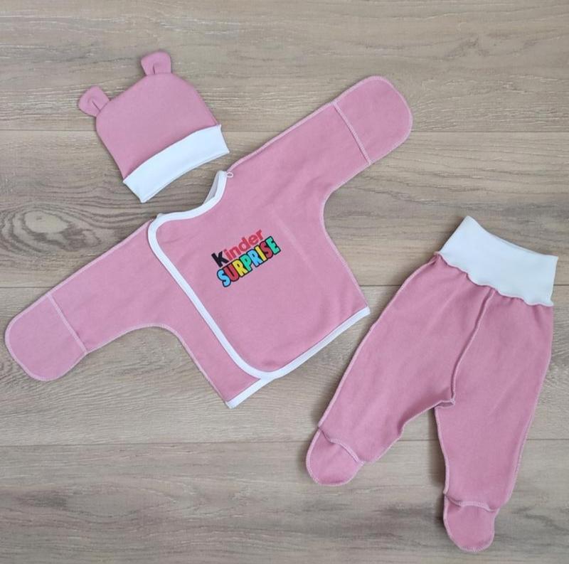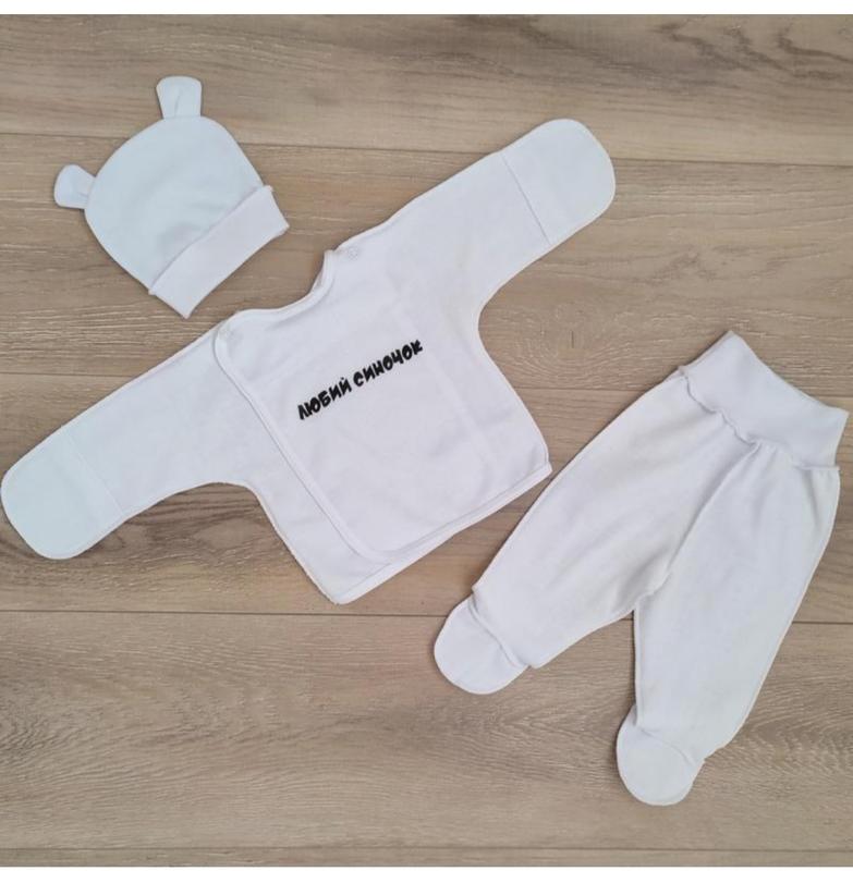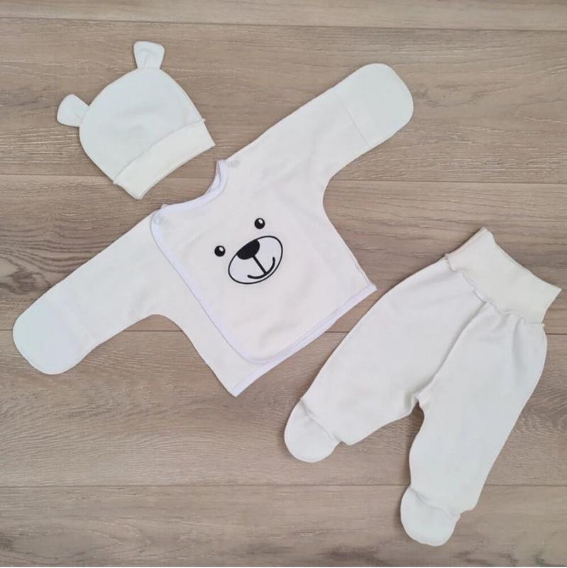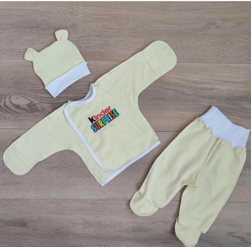 Зручний, практичний, якісний комплект для малюків - прекрано підійде як для повсягденного переодягання так і на виписку з пологового. В комплекті речі для малюка першої необхідності: зручна роспашонка з закритими ручками та зовнішніми швами на кнопочках, повзунки на широкій резинці з зовнішніми швами, шапочка з вушками.