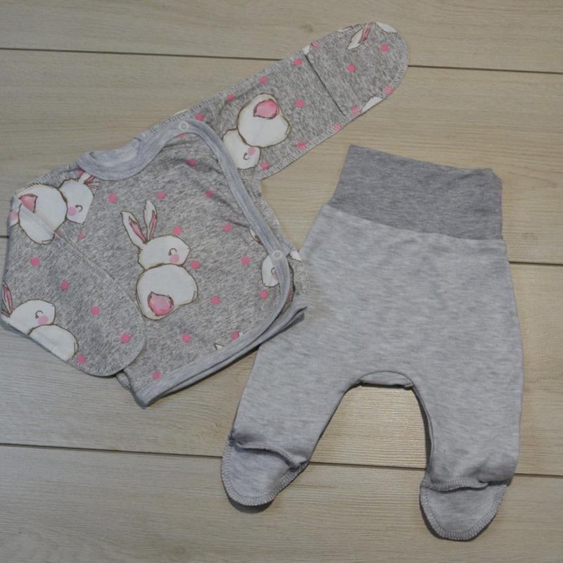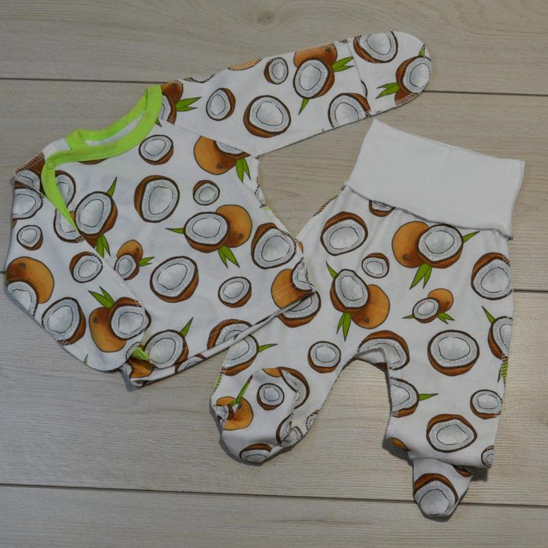0805028, Ясельний комплект із трикотажного полотна інтерлок. Складається із двох предметів распашонка та ползунки. Распашонка застібається на кнопки, ручка з закритої транформується у відкриту в разі необхідності. Ползунки на з мяким стрейчевим поясом.