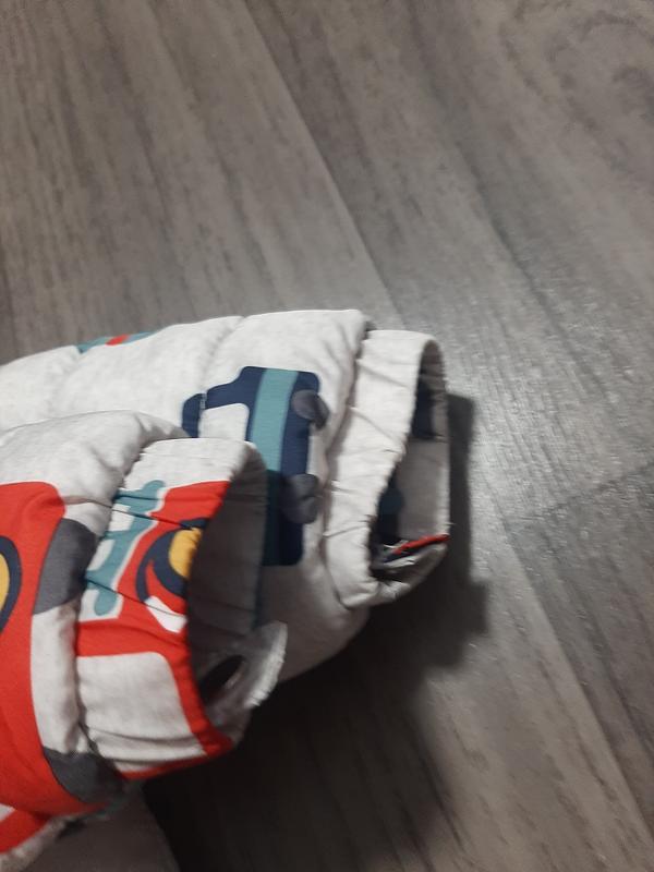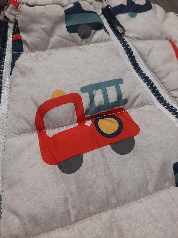 Грудка та спинка утеплені махрою ( травкою), капюшон оздоблений хутром. Гарний та крутий хлопчачий принт з машинками.