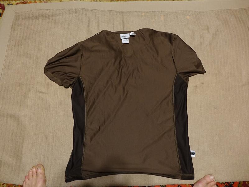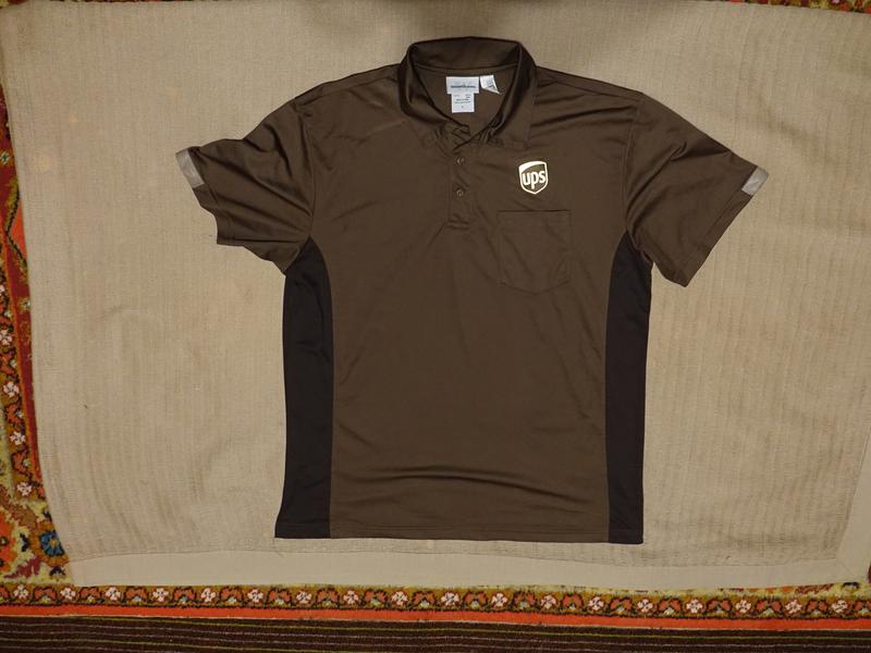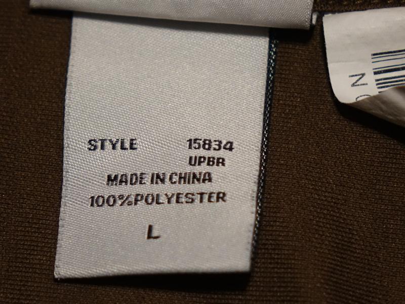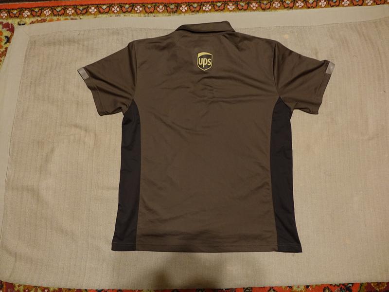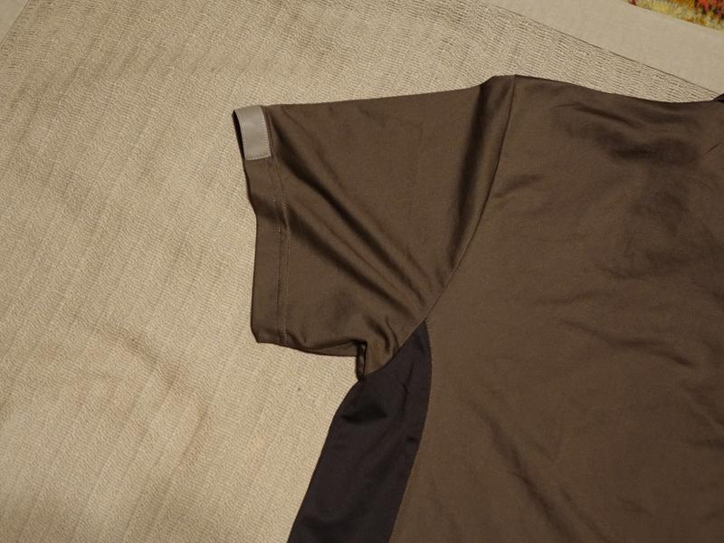 Виріб із короткими вшивними рукавами, невеликим відкладним коміром і короткою застібкою на невеликі ґудзики під тон тканини. Виготовлена модель із приємного на дотик сучасного повітропроникного трикотажу (100% поліестер) комбінованих відтінків коричневого кольору. Зліва на грудях передбачена невелика накладна кишенька, над якою розташовується лого бренда ( аналогічний логотип є й у верхній частині спинки виробу). На краях коротких рукавів є невеликі вставки зі щільнішої тканини світло-коричневого кольору.