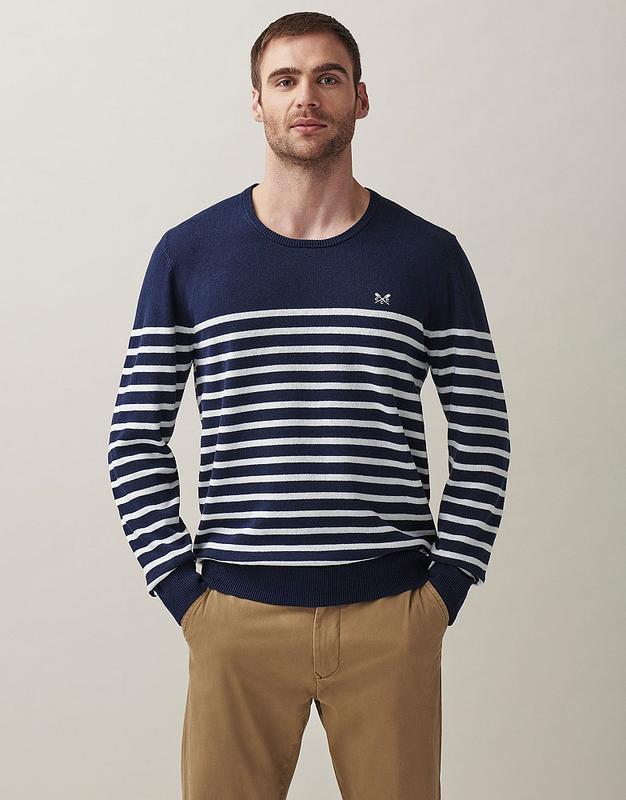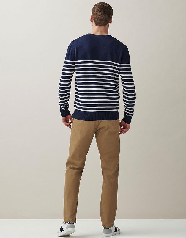Чоловічий темно-синій джемпер із круглим вирізом у подвійну смужку.Стан: новий (не сток!)Тканина: 100% бавовнаРозмір L:плечі - 45 см, пог - 55 см, рукав - 68, довжина - 74 см