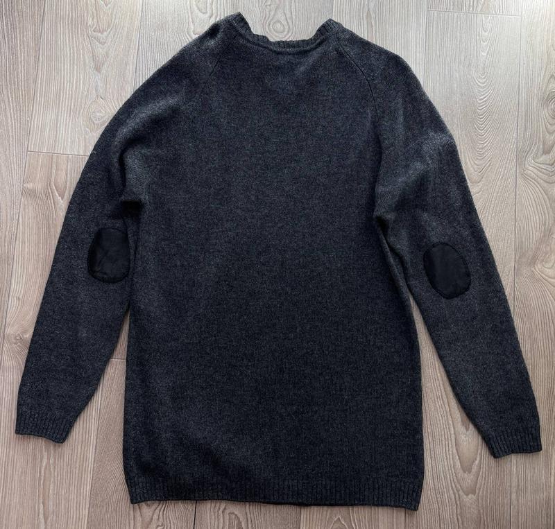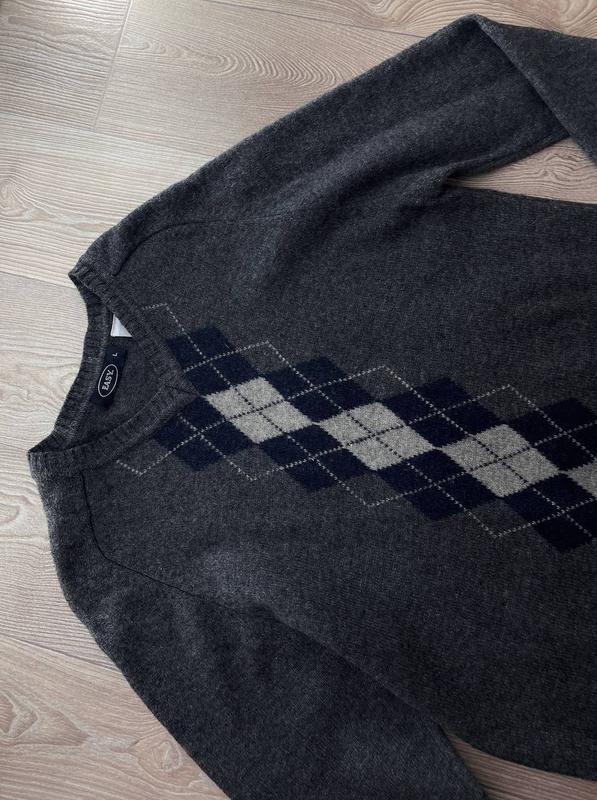 Светер з 100% вовни сірого кольору меланж та ромбами синього та саітло-сірого кольору. V виріз горловини. Рукав-реглан , шкіряні нашивки ліктів.