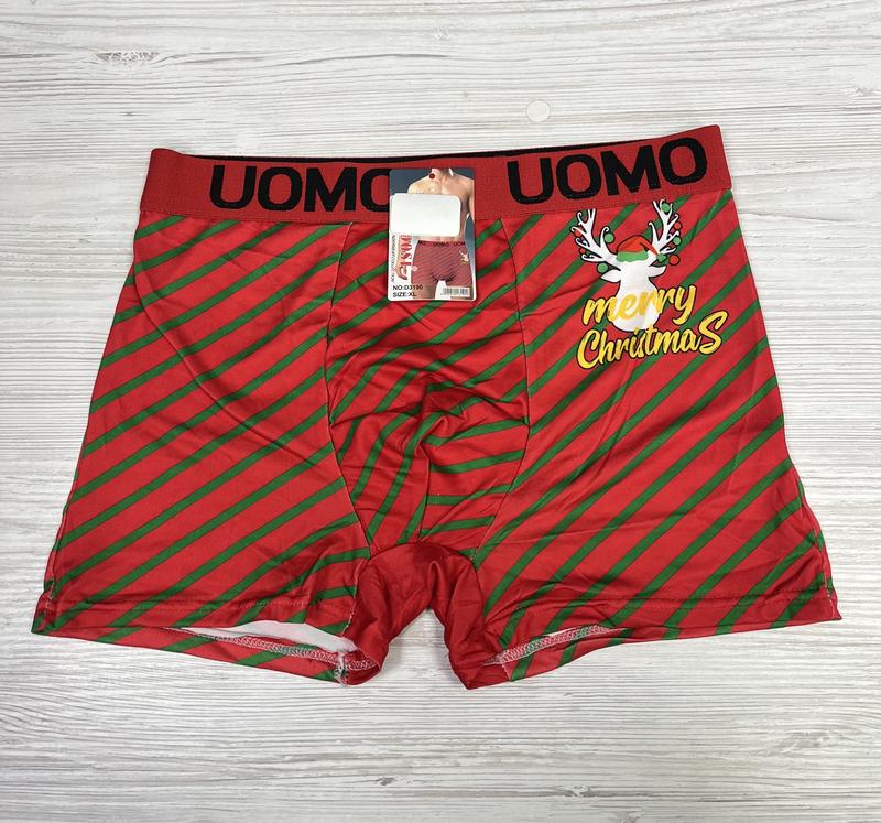 Чоловічі труси з новорічним принтом . Розмір-XL, XXL Мʼяка приємна тканина . Еластична резинка . Напів обхват пояса- XL-34см; XXL-38cм. Посадка- XL-26см; XXL-28см.