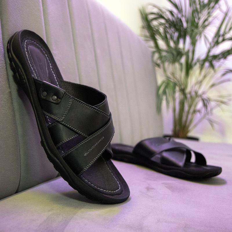 Чорні чоловічі шльопанці українського виробника. Виготовленні з натуральної шкіри та зносостійкої підошви. Довжина підошви: 46 - 31 см 47 - 32 48 - 32,5 49 - 33,3 Стопа має бути менша ніж довжина підошви Перед замовленням уточняйте наявність вашого розміру у менеджера магазину