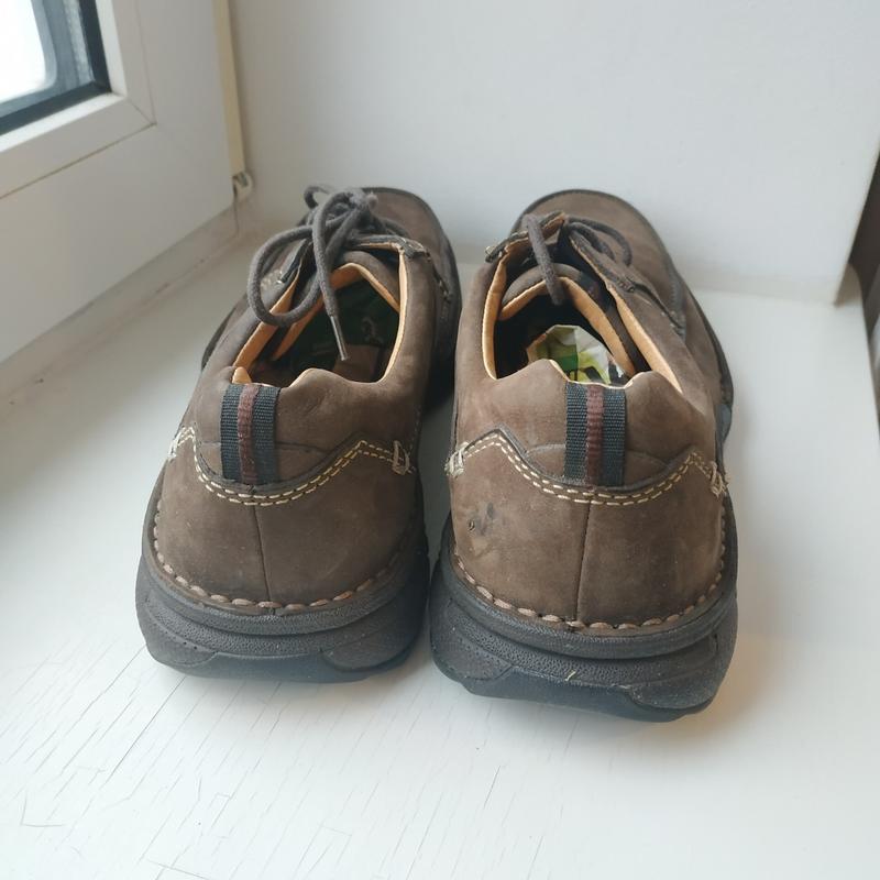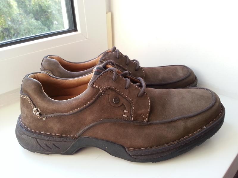 Шкіряні туфлі Clarks 41 розміру, 7G, устілка 28 см. від краю до краю. Устілка виймається. Матеріал натуральна шкіра нубук, міцна, якісна. В середині матеріал натуральна шкіра, гладка. Міцний задник. Взули всього два рази, стан нової речі. Без нюансів. Все якісно прошито, оригінальні. Оброблені водовідштовхувальним засобом. Made in Vietnam.