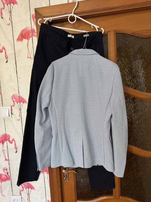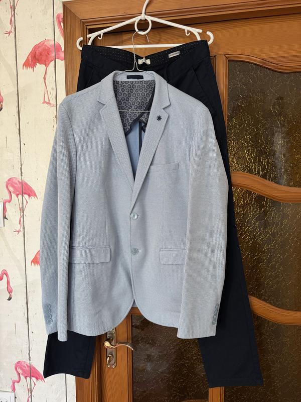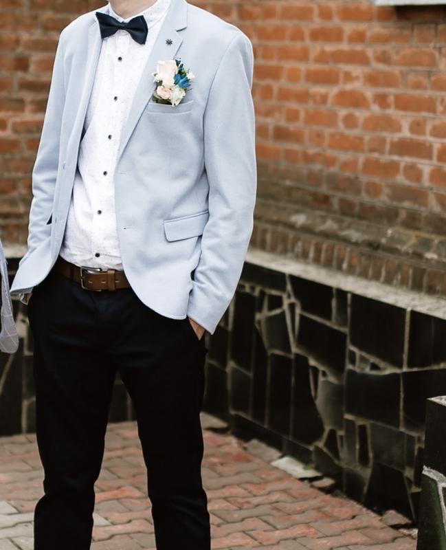 Гарний легкий костюм нареченого/чоловічий костюм з блакитним піджаком.У комплект входить:- піджак (блакитний);- сорочка (біла з принтом);- брюки (сині);- метелик (синій).За детальними замірами пишіть.