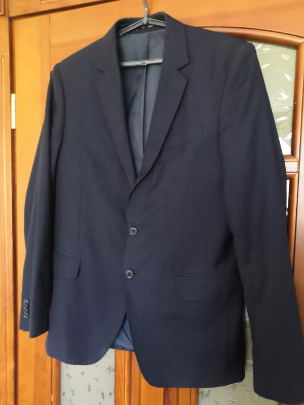 Чоловічий темно-синій костюм Arber прилеглий силует. Однобортний піджак з прямим лацканом та застібкою на 2 гудзики, з двома кишенями з клапаном та двома шліцями. Ширина плечей 44 см Довжина рукава 66 см Довжина піджака 74 см Обхват талії 100 см Штани середньої посадки, звужені до низу, зі стрілками, із застібкою на блискавку та гудзик, із двома похилими прорізними кишенями. Об'єм талії 100 см Довжина 100 см (підшито із запасом 4 см) Костюм у відмінному стані. 65% Поліестер, 35% Віскоза