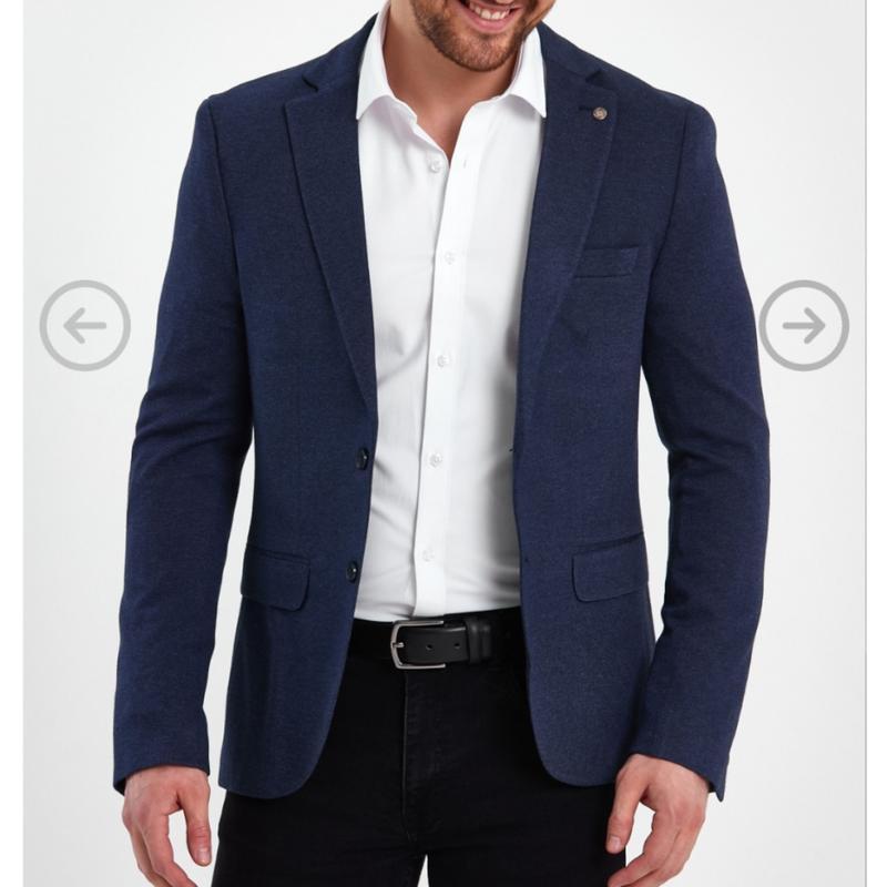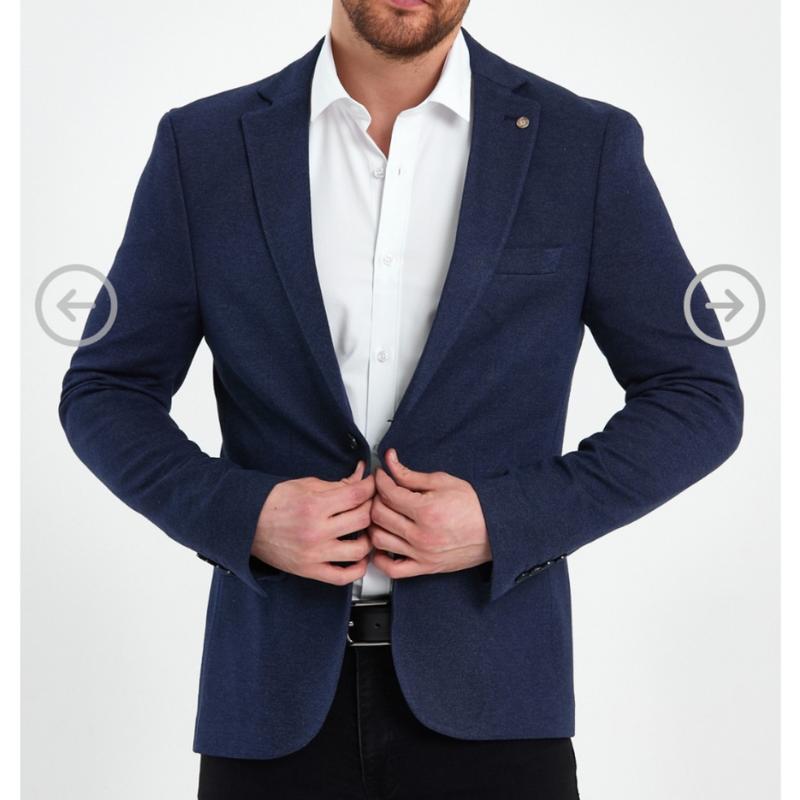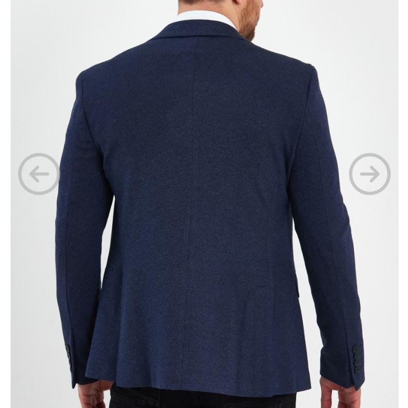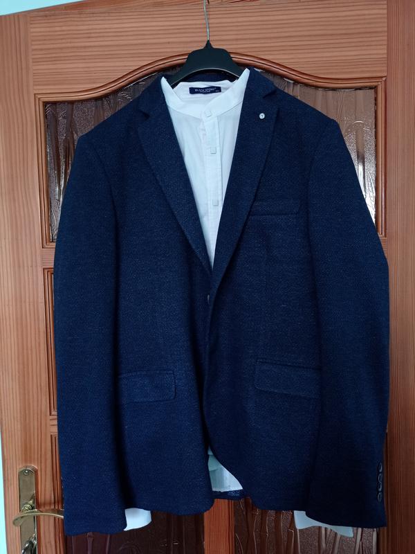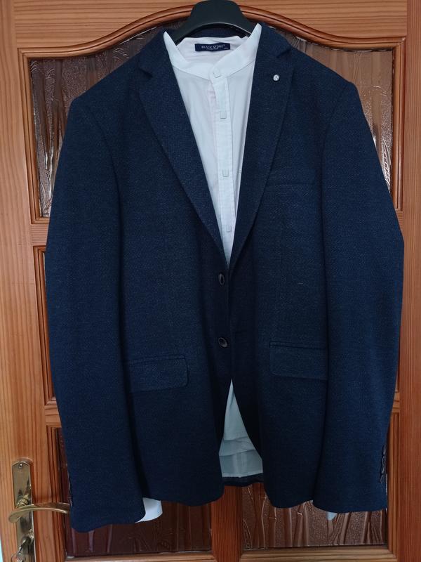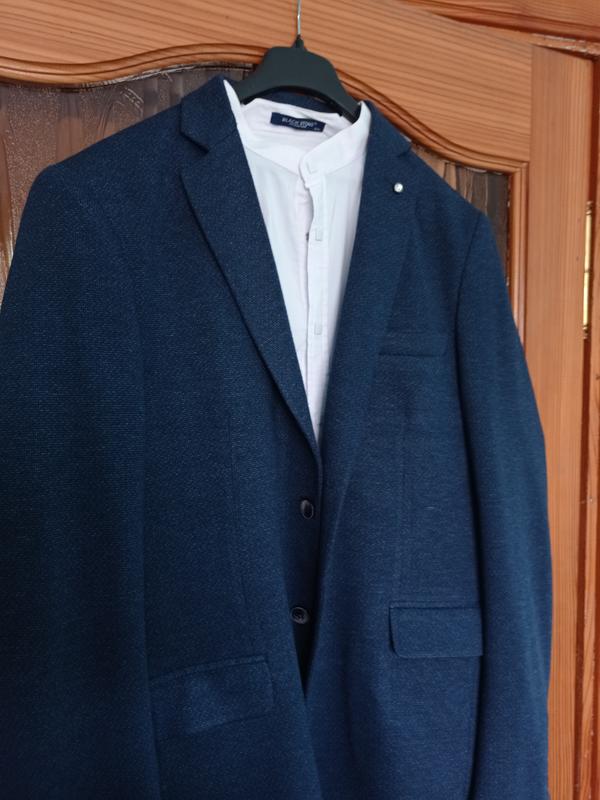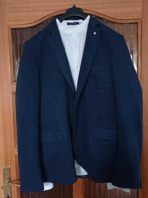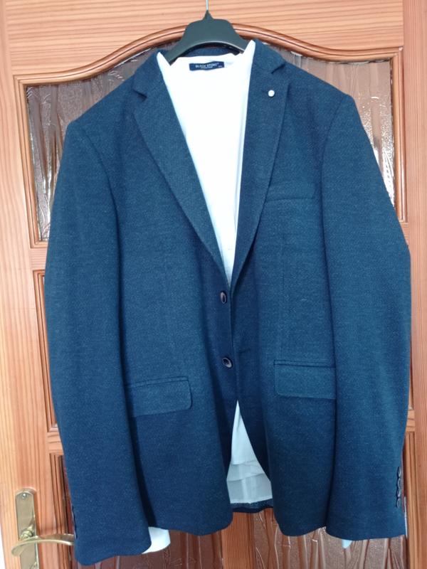 піджак довжина 75 рукав 71груди 56плечі 56приємний на дотик. Темно синього кольору.