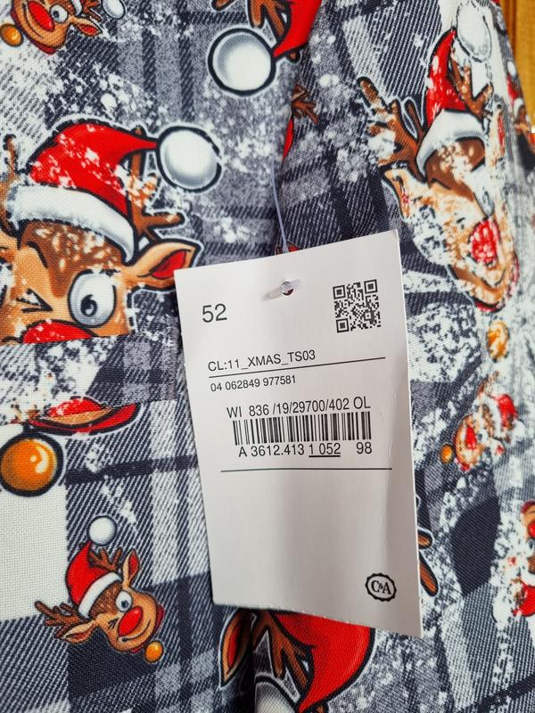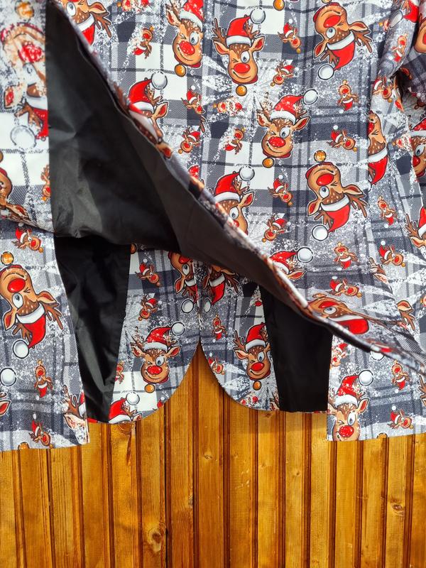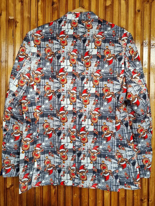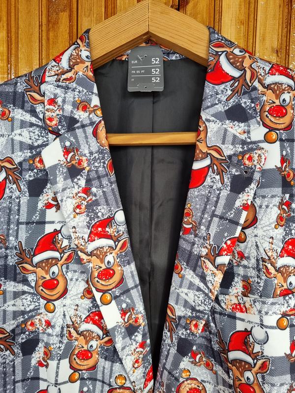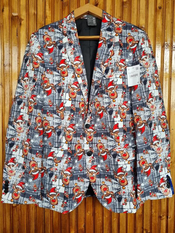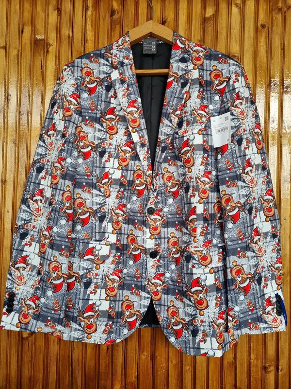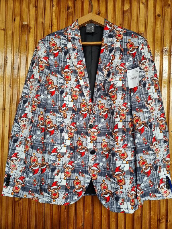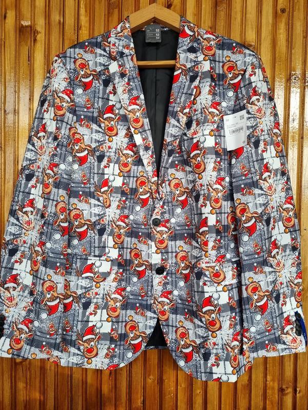 Піджак чоловічий C&A різдвяний, новорічний з оленями. Відмінно для святкування Нового Року, корпоративу, фотосесії. В наявності розмір по бірці 52 (XL), можна на L-XL. Поліестер.