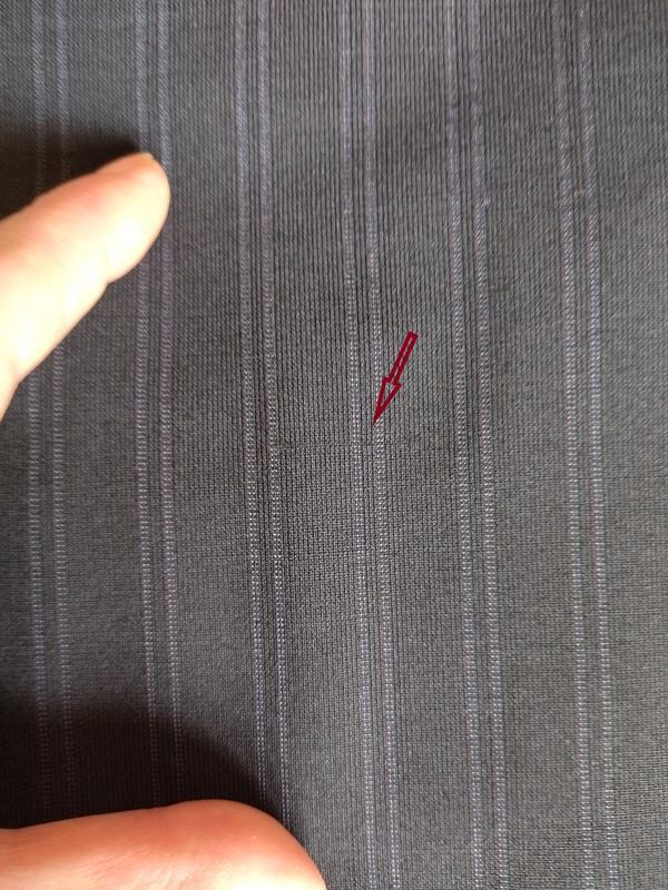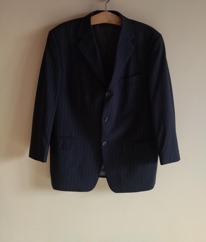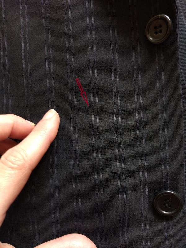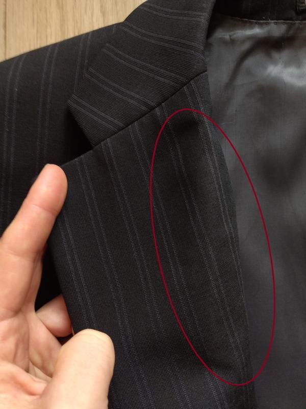 Піджак забруднений, є плями, на підкладці, на тканині піджака, спереду, на плечах, на шиї та рукавах. Ззаду ближче до низу малопомітна затяжка (останнє фото), є запах залежаного одягу (довго зберігався).