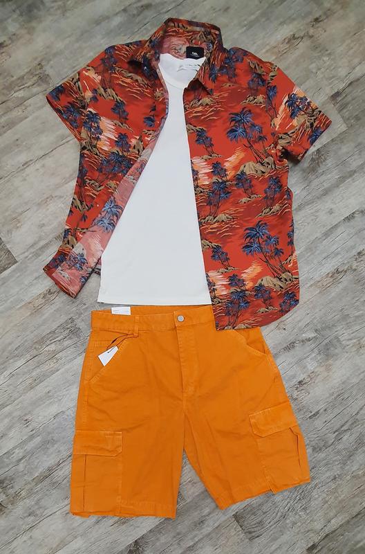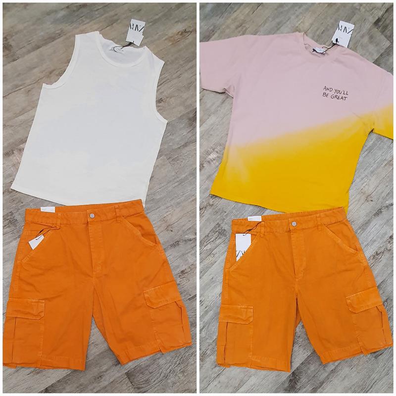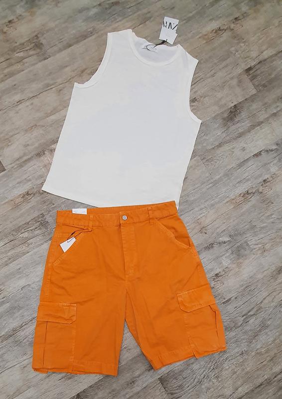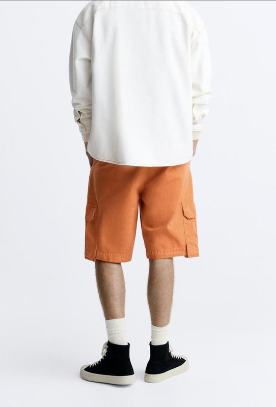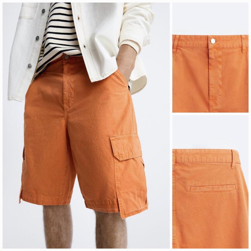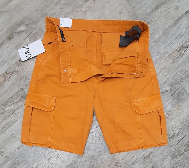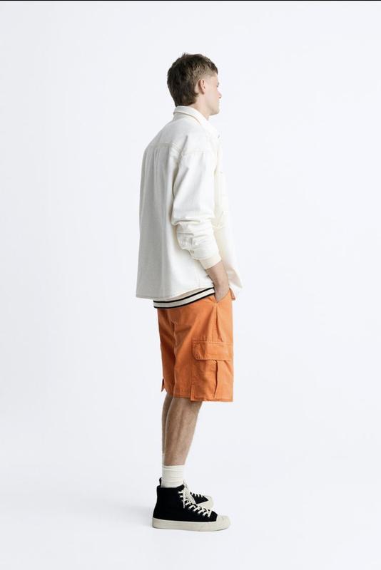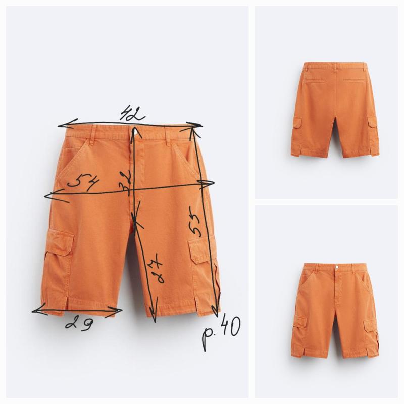 Трендові літні шорти-бермуди Ripstop cargo від Zara. Шорти-бермуди вільного крою із фактурної тканини ріпстоп, стійкої до розривів. Передні кишені та задні прорізні кишені. На штанинах накладні кишені із клапанами. Застібка на блискавку та гудзик спереду. Розмір 40. Заміри на фото.