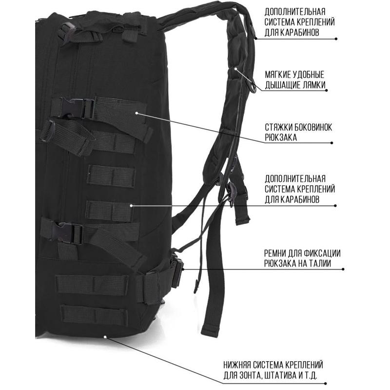 Рюкзак туристичний має містке основне відділення, безліч передніх кишень на блискавці. Рибалкам також підходить тактичний рюкзак, ви зможете укомплектувати його додатковими елементами, використовуючи систему кріплення MOLLE. Тактичний рюкзак дозволяє здійснювати багатокілометрові марш-кидки без зупинки.