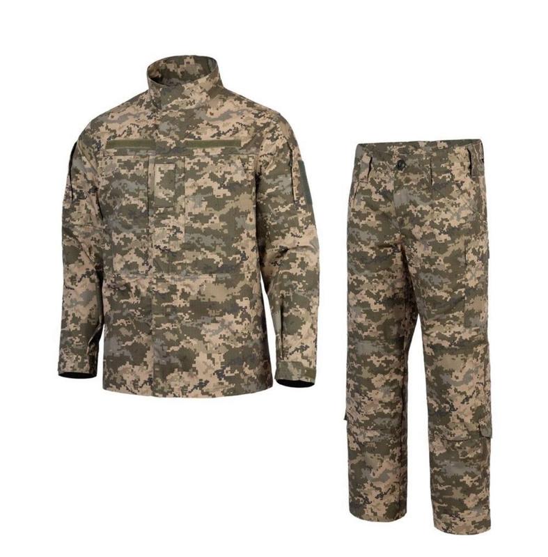 Костюм літній польовий статутний піксель ЗСУ Артикул: 03453 Артикул: 03454 Розміри: 42-60, 62, 64, 66 Костюм тактичний Піксель - бойовий комплект, виготовлений за ТУ Міністерства оборони України. Виконаний із міцного матеріалу Rip-Stop, стійкого до зносу та розривів. Камуфляж ММ-14 (піксель) забезпечує ефективне маскування. Має підсилюючі кишені для вставних наколінників і налокітників, наскрізні кишені на грудях із блискавками та липучками. Куртка застібається на блискавку з клапаном на липучках, штани — на блискавку та гудзик. Ідеальний для екстремальних умов. Характеристики: Матеріал: Rip-Stop; Камуфляж: MM-14 (піксель); Особливості: кишені для наколінників/ налокітників, наскрізні кишені, блискавки, липучки; Призначення: військове використання, активний відпочинок;