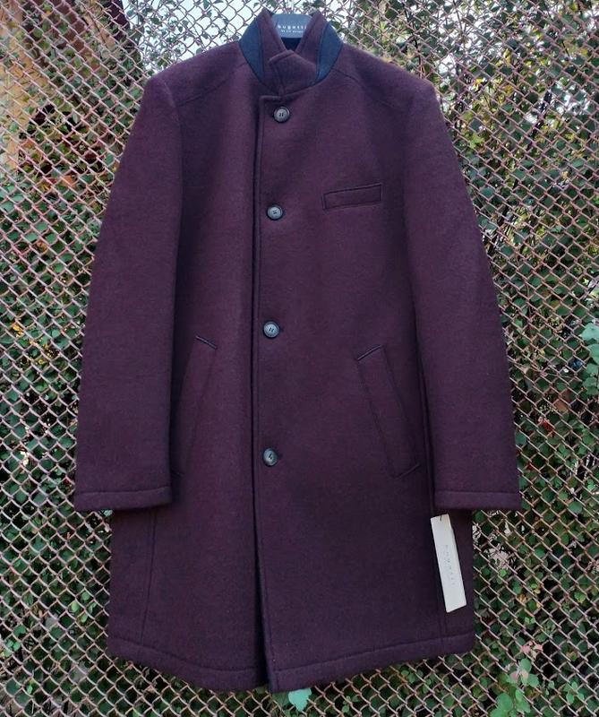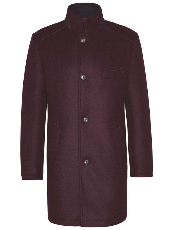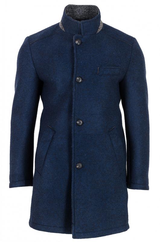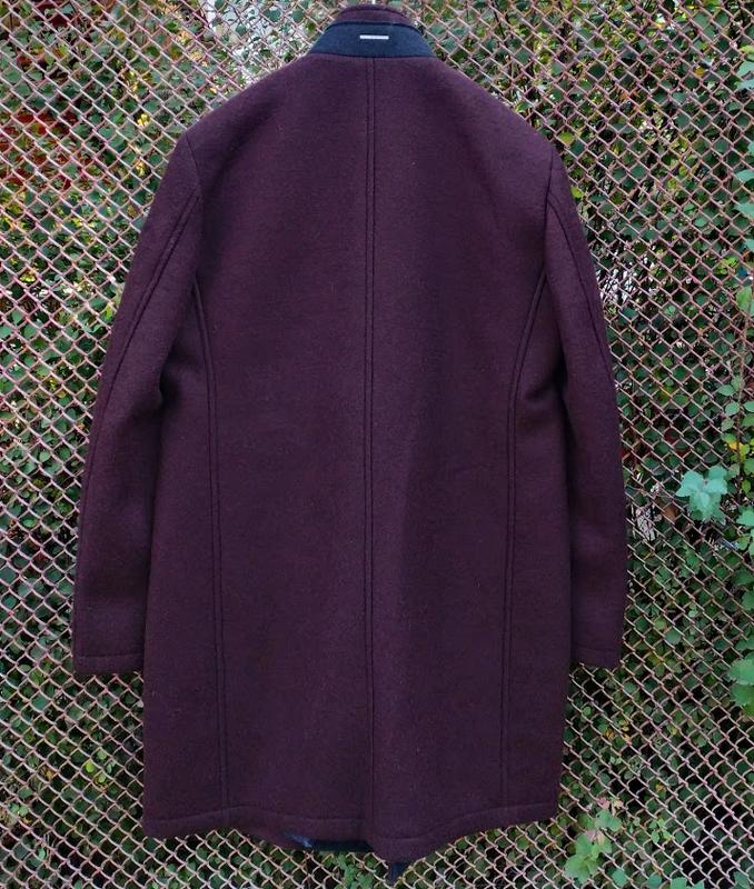Пальто має планку з безперервними ґудзиками та високий комір.