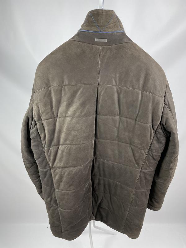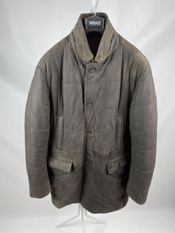 Фирменная, удлиненная, кожаная с мехом внутри дубленка.