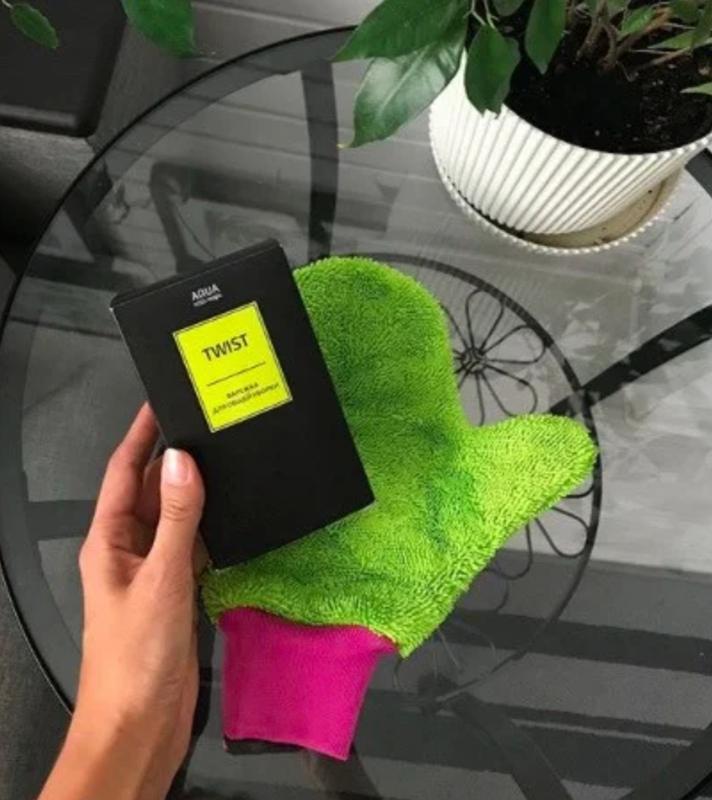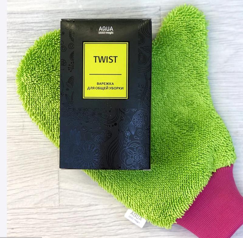 Изготовлена на основе инновационной нити «Твист», представляющей собой особое плетение из рассечённого ультратонкого микроволокна в виде скрученной по спирали петельки. Благодаря такому плетению варежка обладает способностью поглощать и удерживать влагу, грязь и пыль в объёмах, в разы превышающих размеры материала. Удлинённый игольчатый ворс позволяет беспрепятственно проникать в труднодоступные углубления и щели.