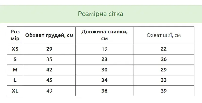 XS: Обхват грудей 29 см, Довжина спинки 19 см, Обхват шиї 22 см