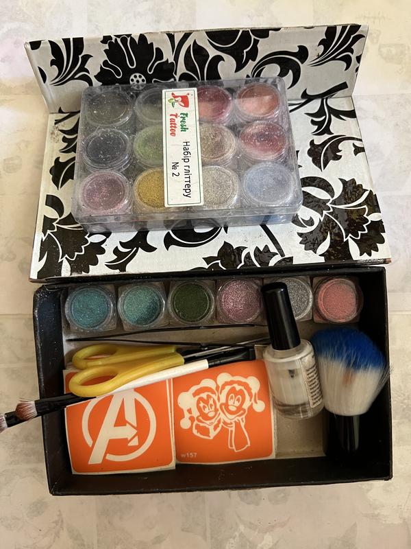 Продам набір для блиск тату, в набір входить 18 баночкою з блискітками, спеціальний пінцет, щіточка для змахування блискіток, 65 трафаретів на різні теми та для різних свят, та коробочка в якій все компактно зберігається. Клей (пів баночки), дві щіточки для нанесення та ножиці відаю безкоштовно